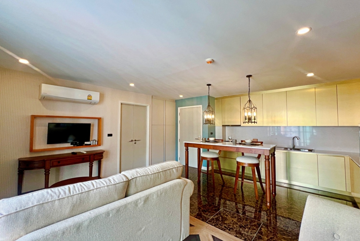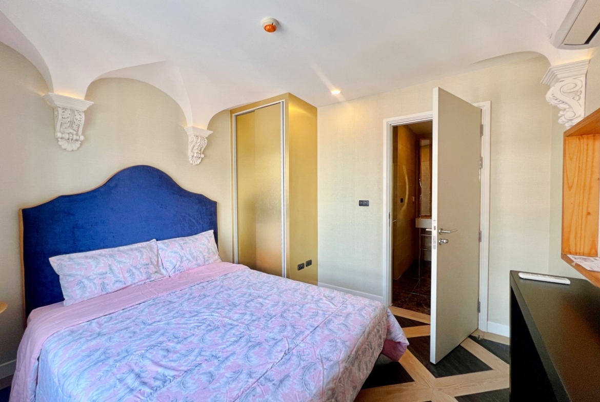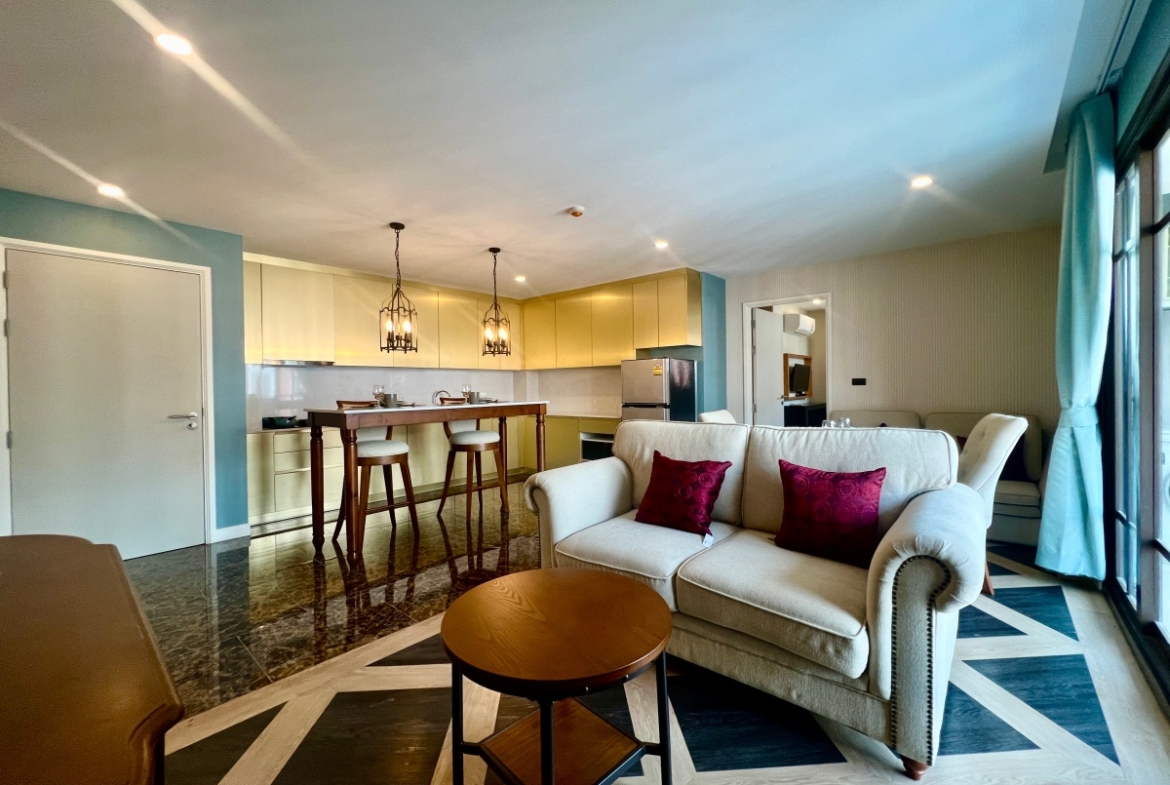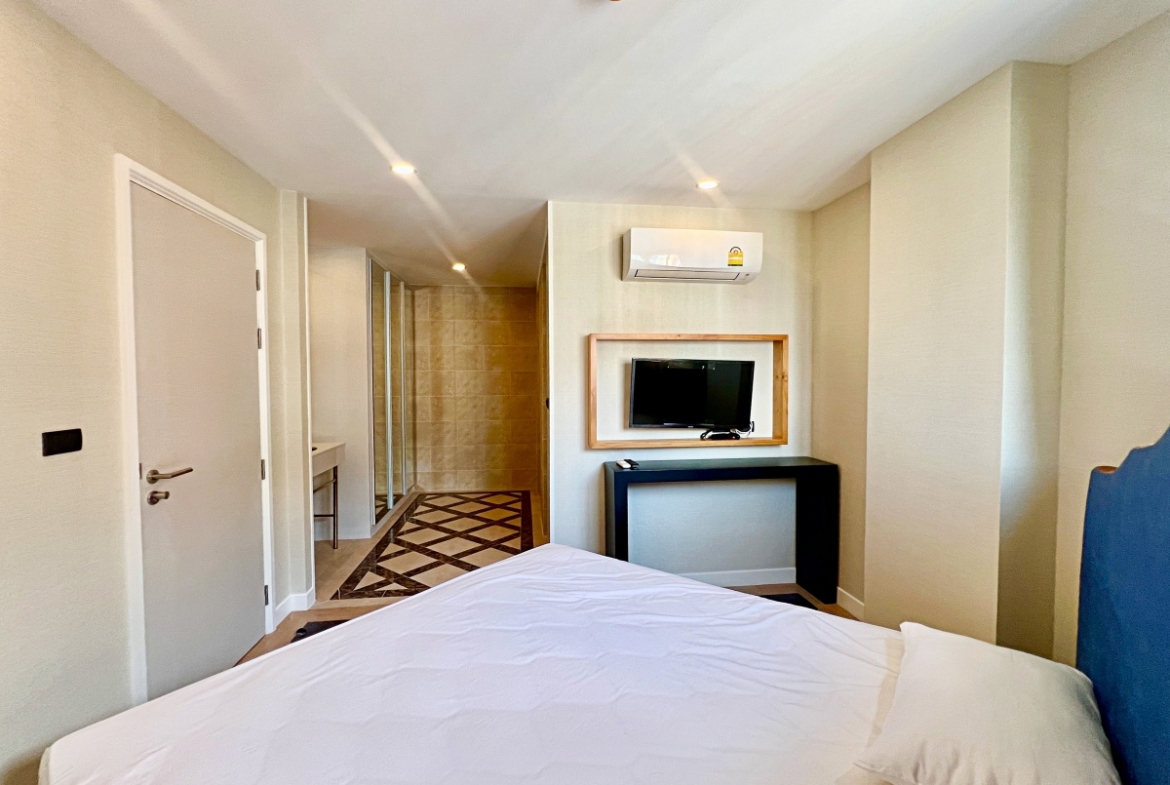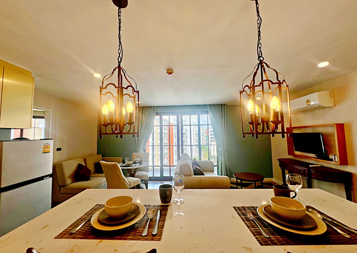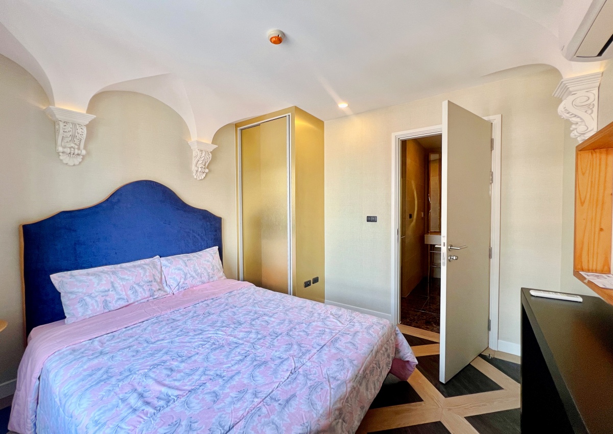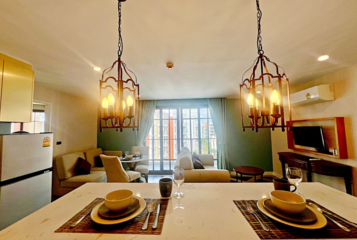 Espana Condo Resort Pattaya is located on Jomtien Second Road, A 14-minute walk from Jomtien Beach and restaurants, easy access to Sukhumvit Road. The facilities included a lagoon swimming pool, fitness, parking, and 24-hour security. This unit features 2 bedrooms and 2 bathrooms, located on the 7th floor of Building C, offering 72 square meters of living space. It comes fully furnished with a large European kitchen, dining and living area, and a balcony with a pool view. This unit is for rent and is ready to move in!