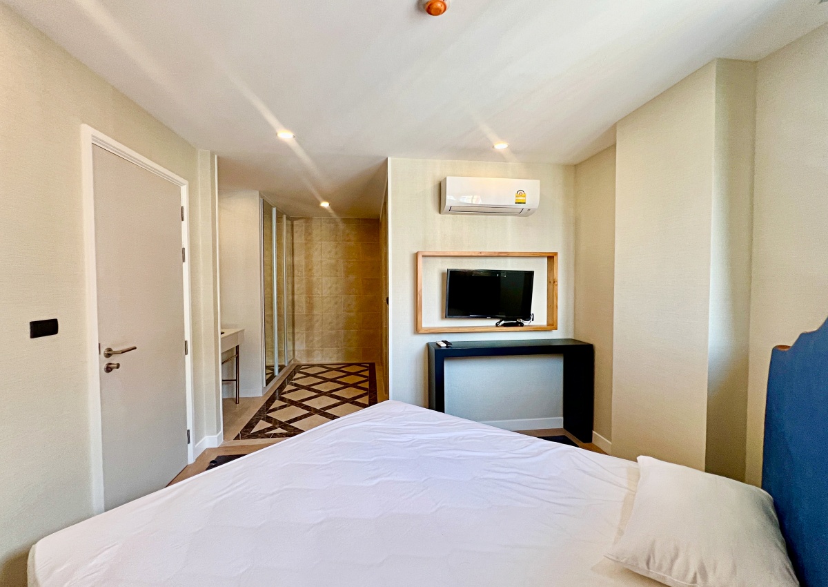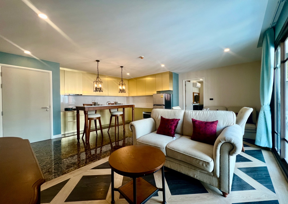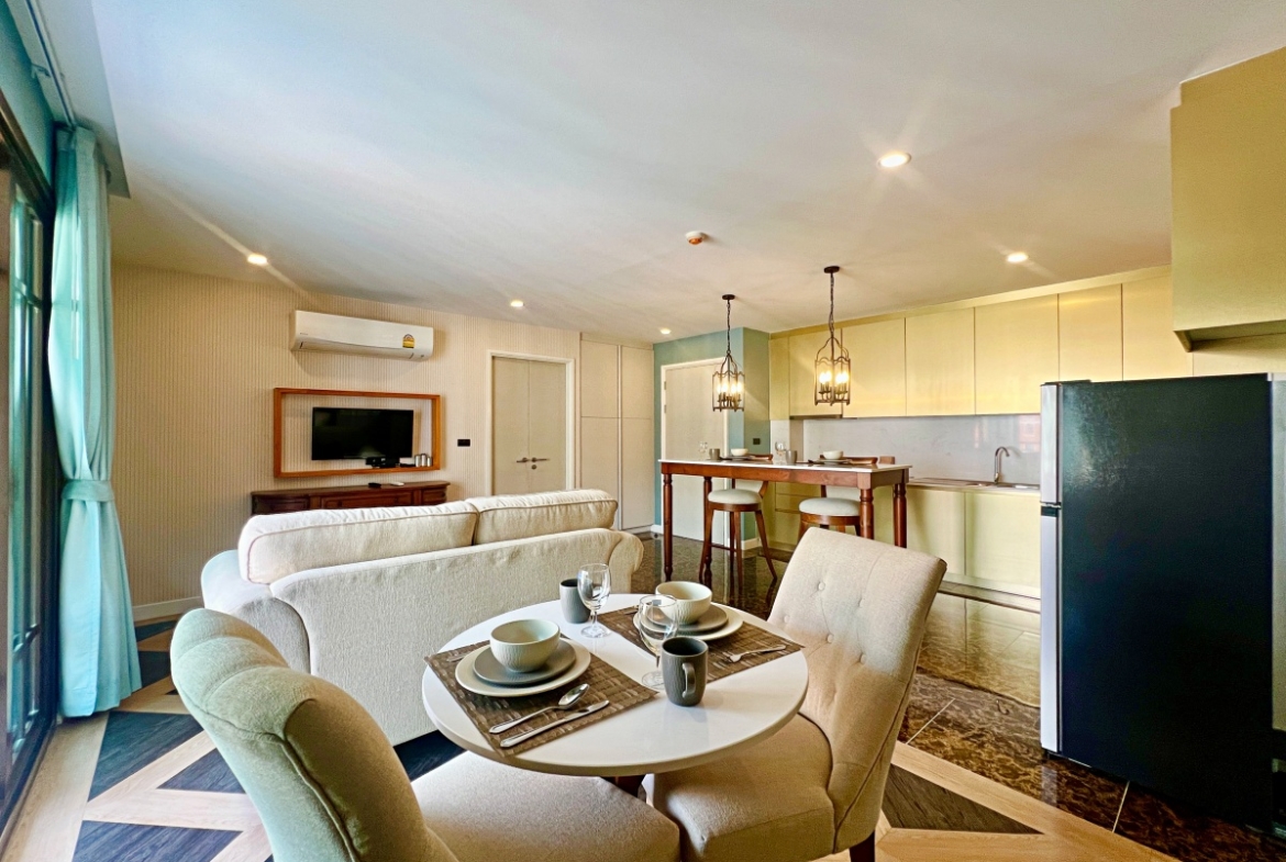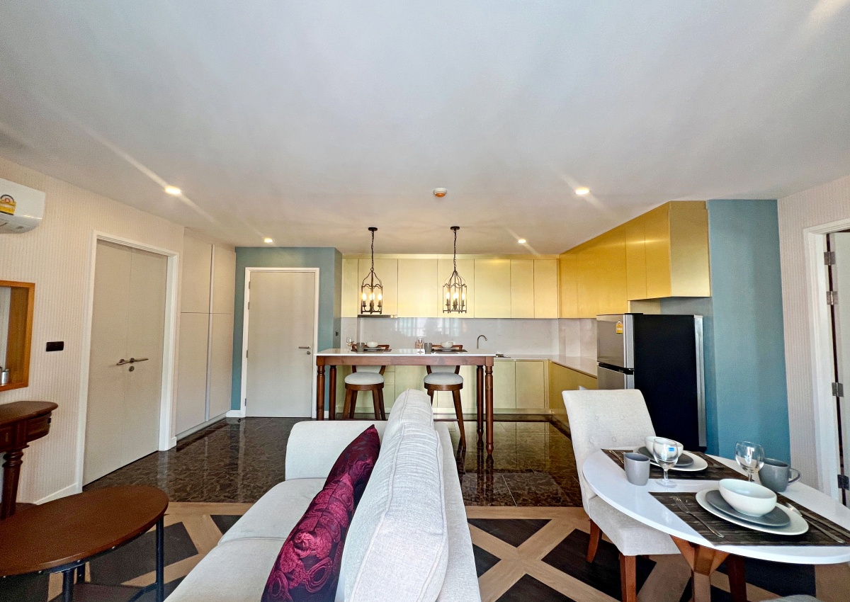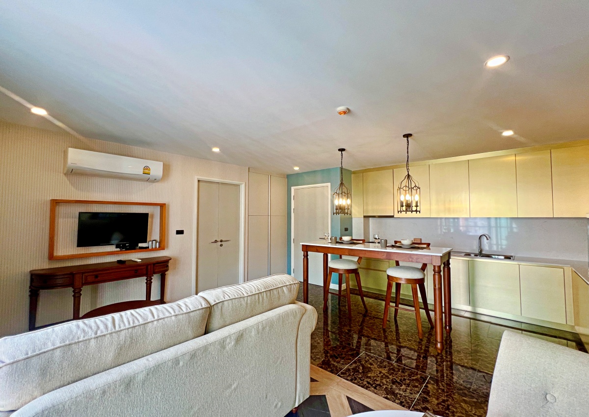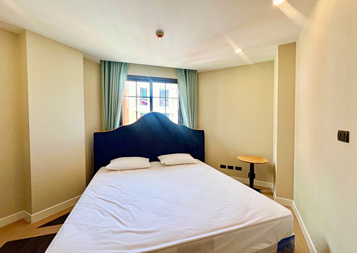 Espana Condo Resort Pattaya is located on Jomtien Second Road, A 14-minute walk from Jomtien Beach and restaurants, easy access to Sukhumvit Road. The facilities included a lagoon swimming pool, fitness, parking, and 24-hour security. This unit features 2 bedrooms and 2 bathrooms, located on the 7th floor of Building C, offering 72 square meters of living space. It comes fully furnished with a large European kitchen, dining and living area, and a balcony with a pool view. This unit is for rent and is ready to move in!