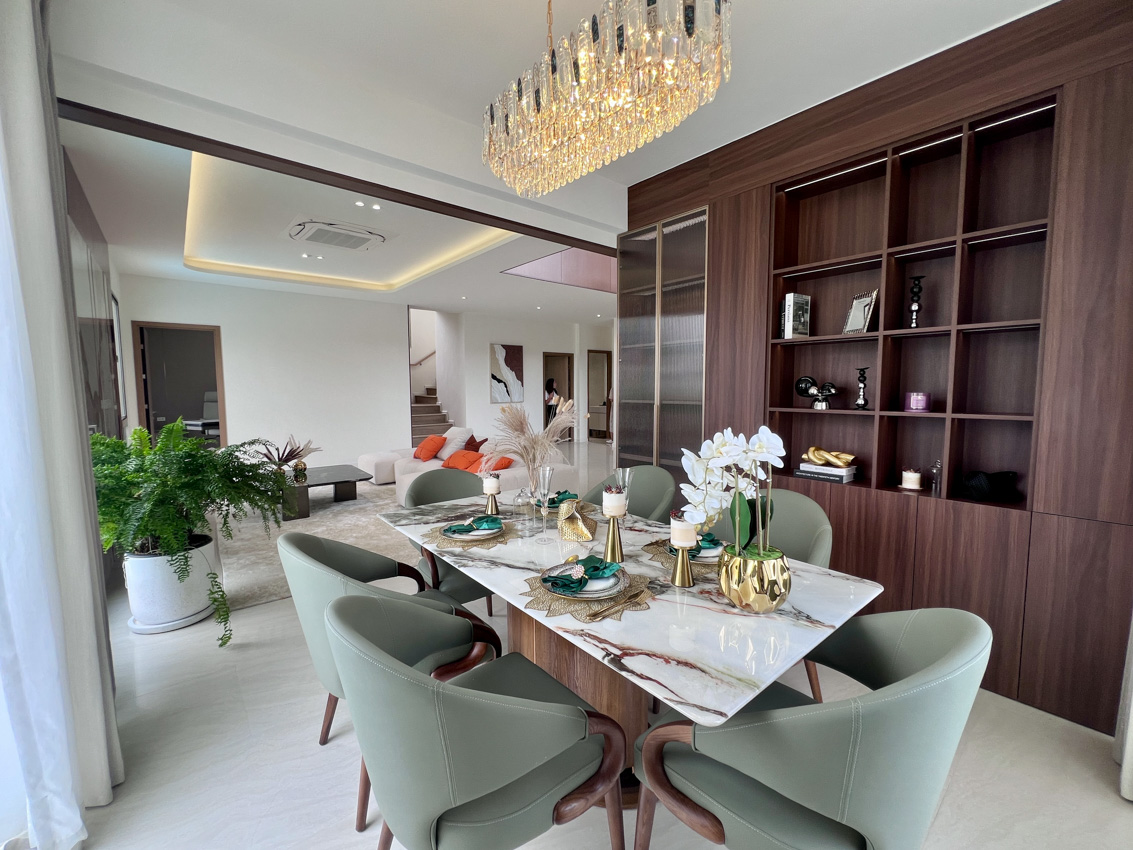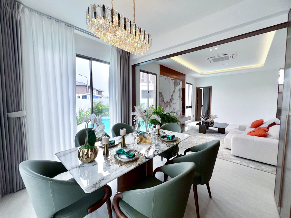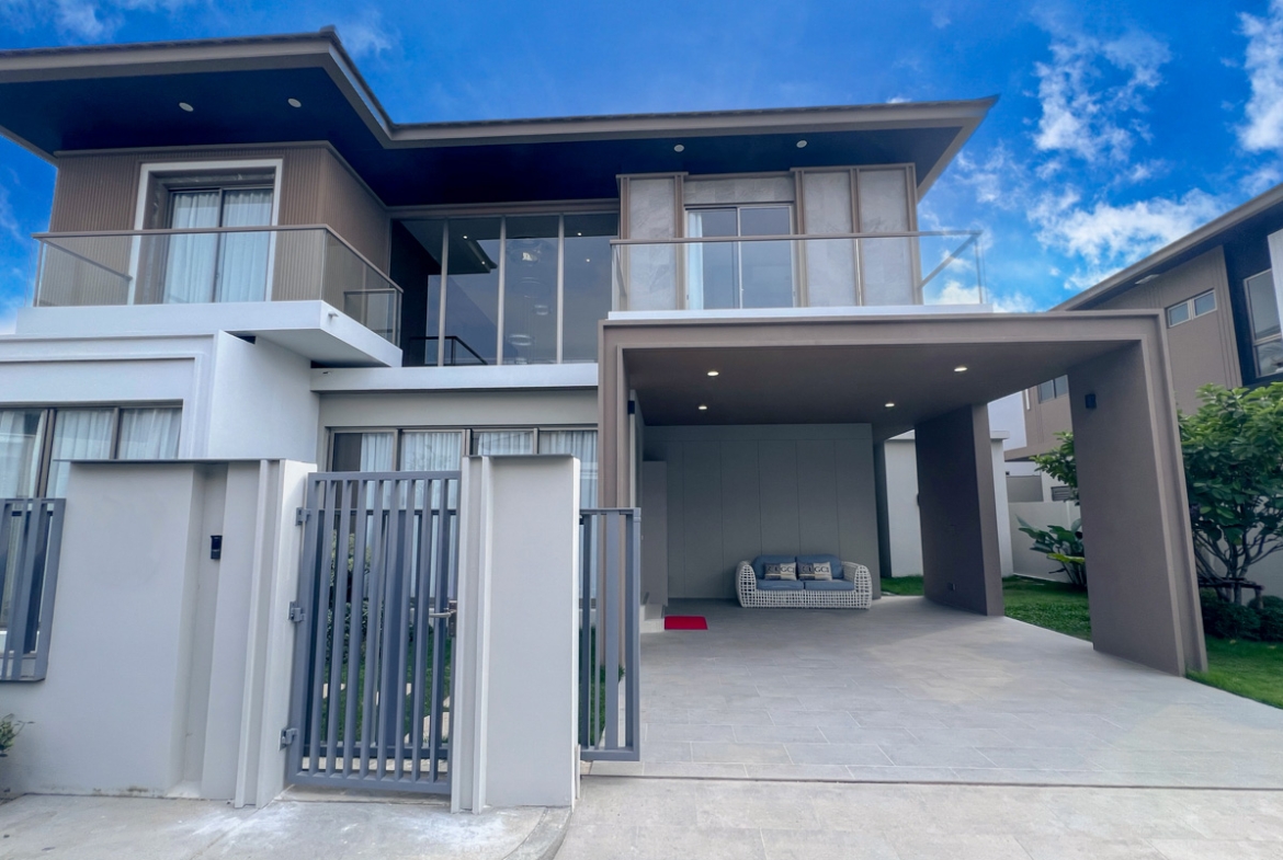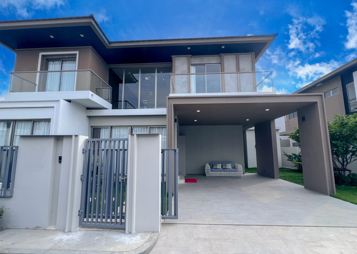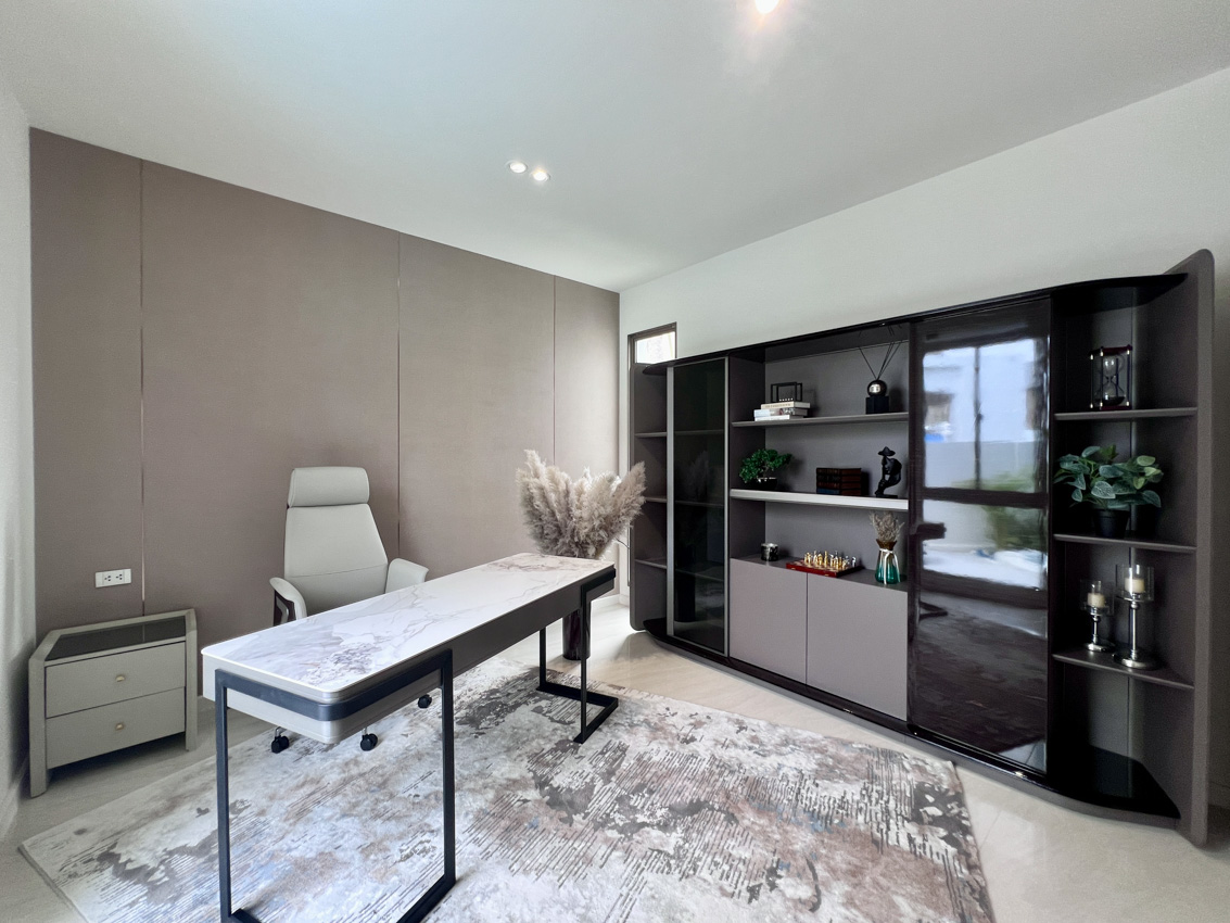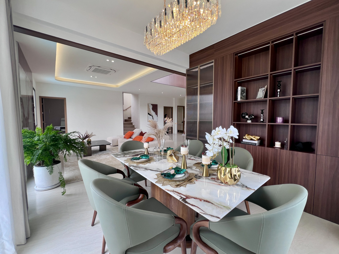 The most spacious house, uniquely designed to serve every functional need of all generations in a double high-volume space with a high ceiling. Experience the freedom in living space with your private bathrooms in all four bedrooms, one with a walk-in closet, an additional storage room, two parking spaces, a multi-purpose pavilion, and an option of a spacious swimming pool to elevate comfort for all family members.