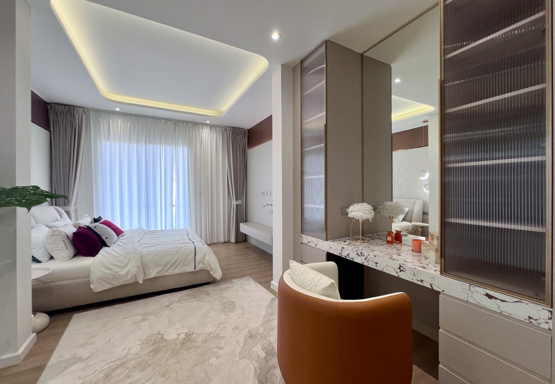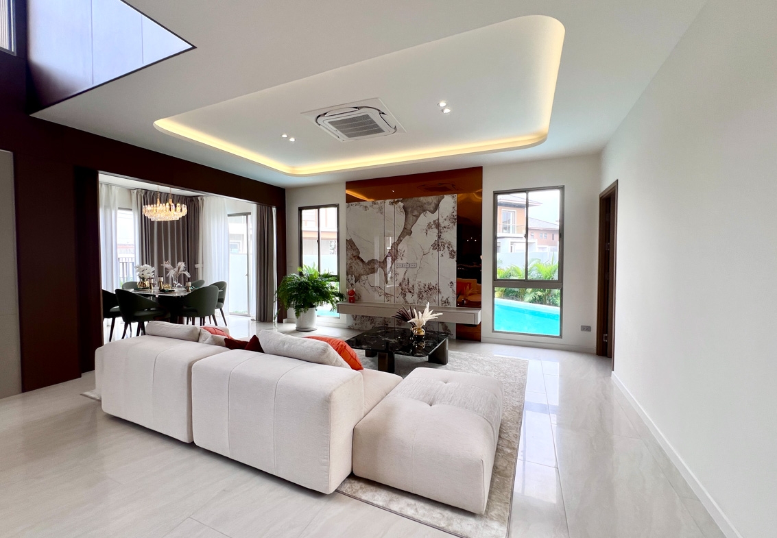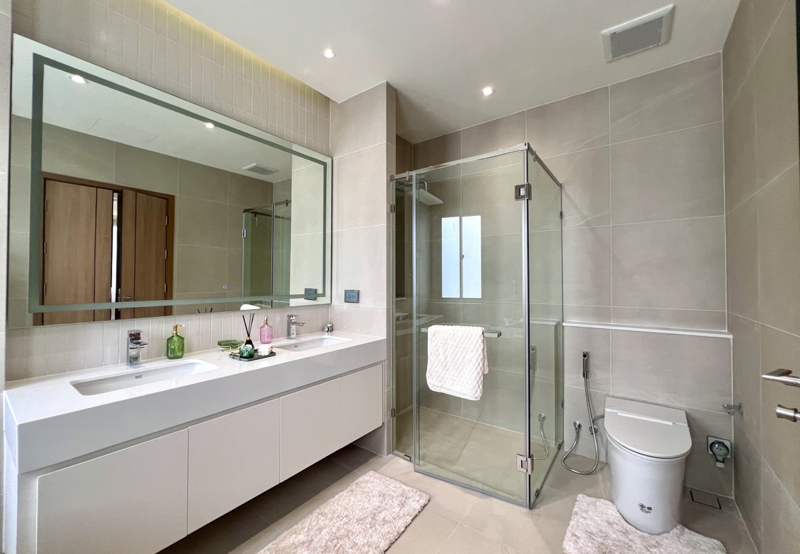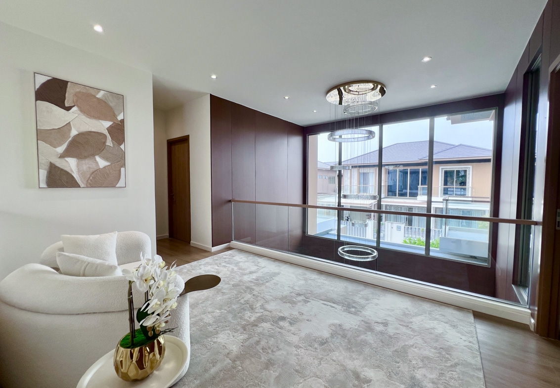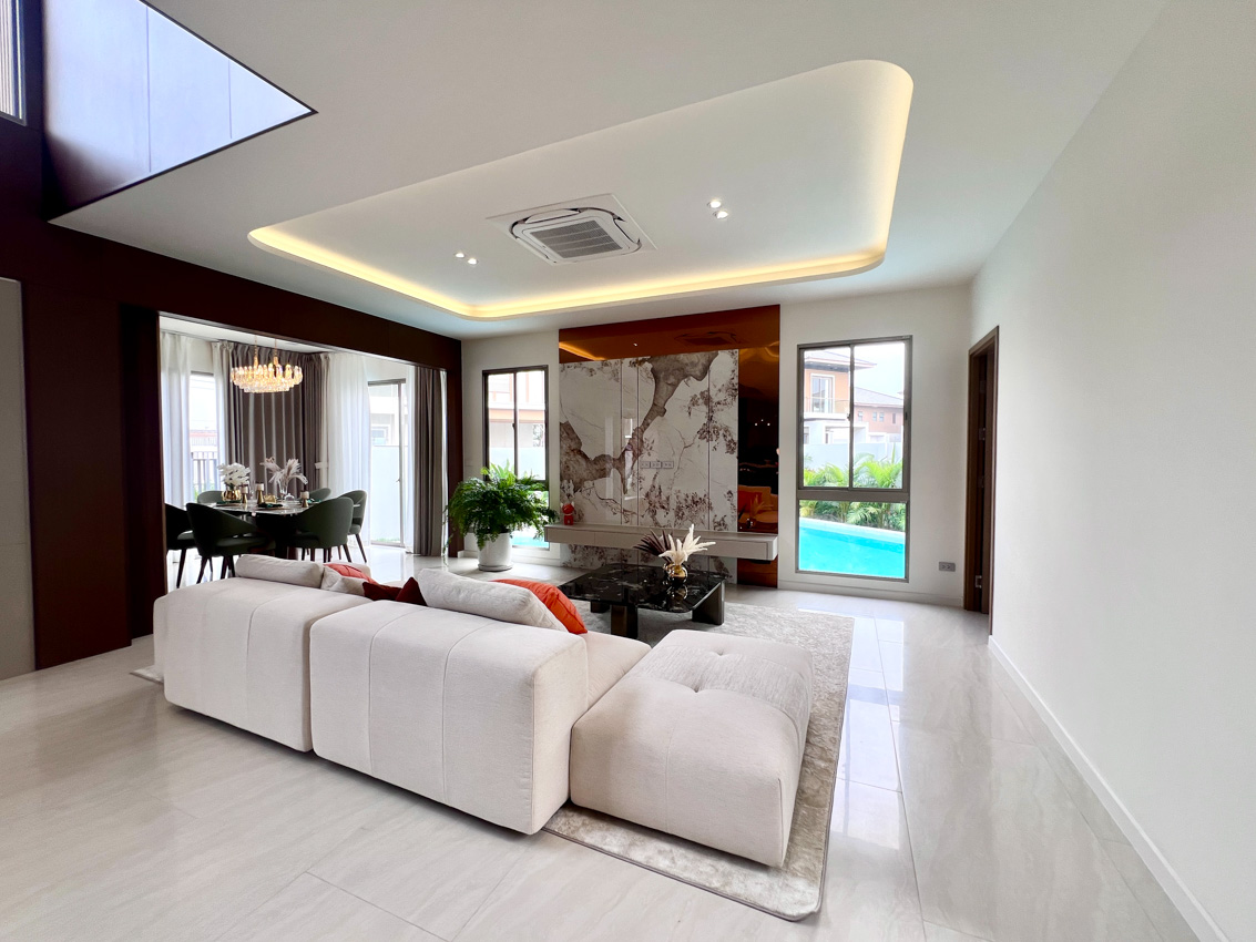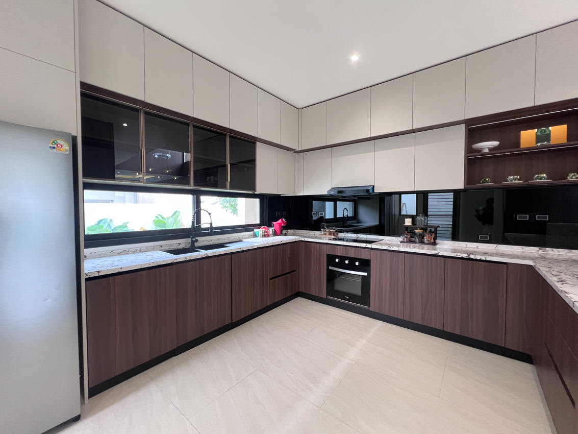 The most spacious house, uniquely designed to serve every functional need of all generations in a double high-volume space with a high ceiling. Experience the freedom in living space with your private bathrooms in all four bedrooms, one with a walk-in closet, an additional storage room, two parking spaces, a multi-purpose pavilion, and an option of a spacious swimming pool to elevate comfort for all family members.