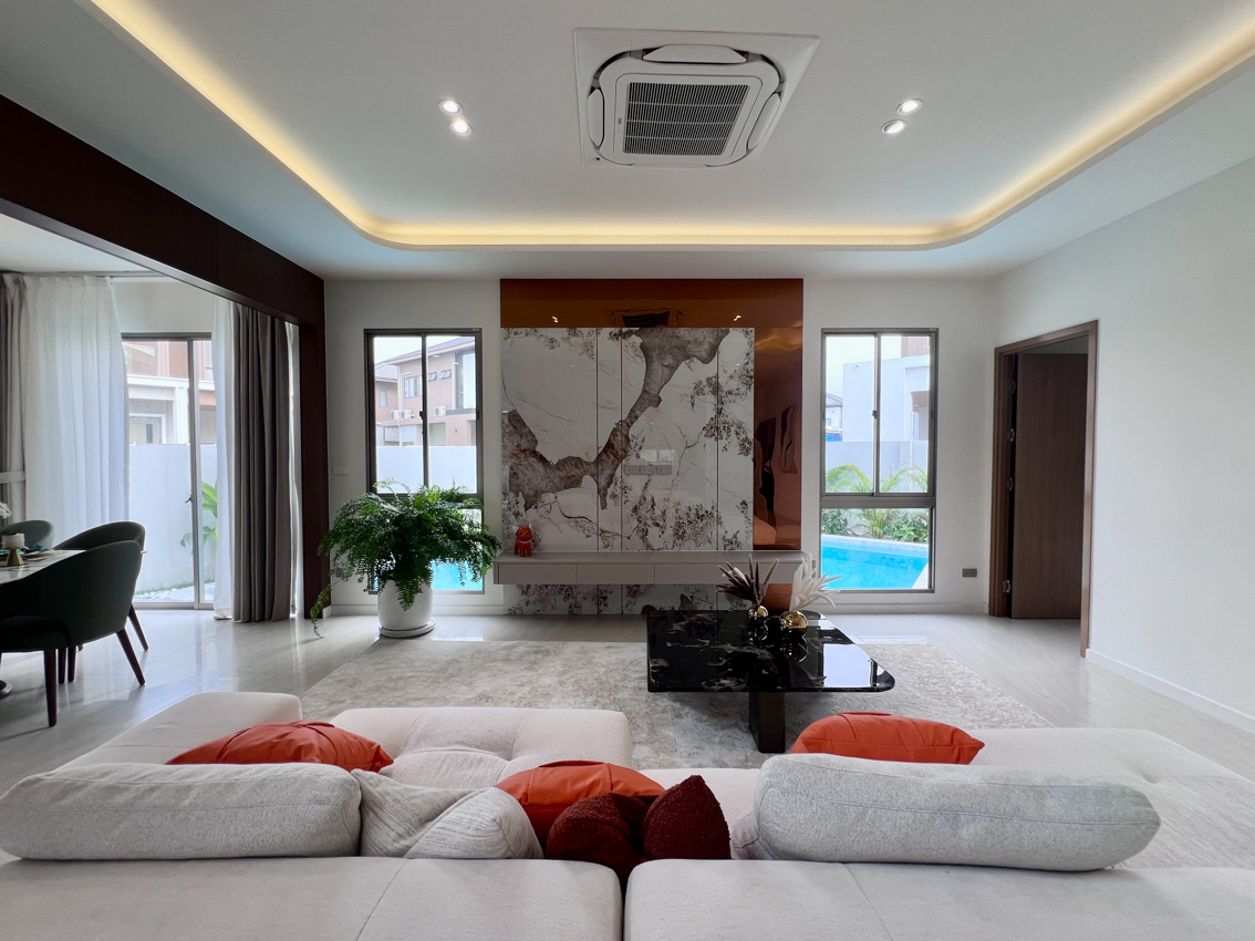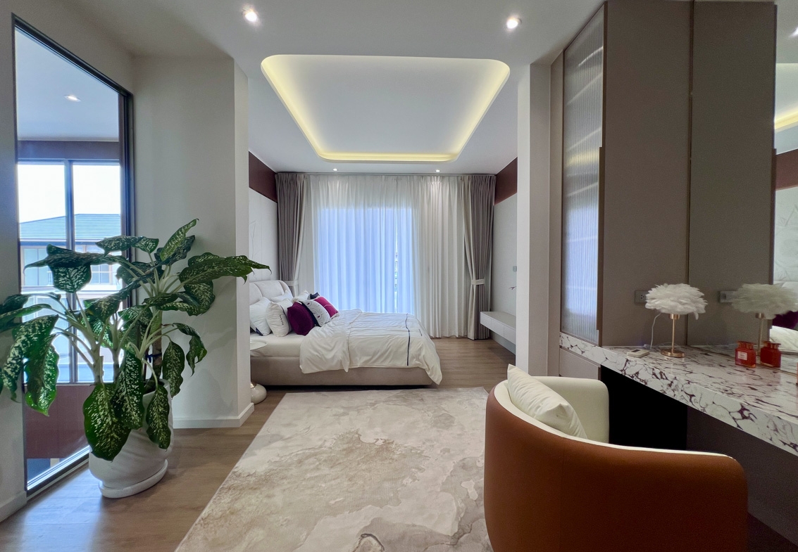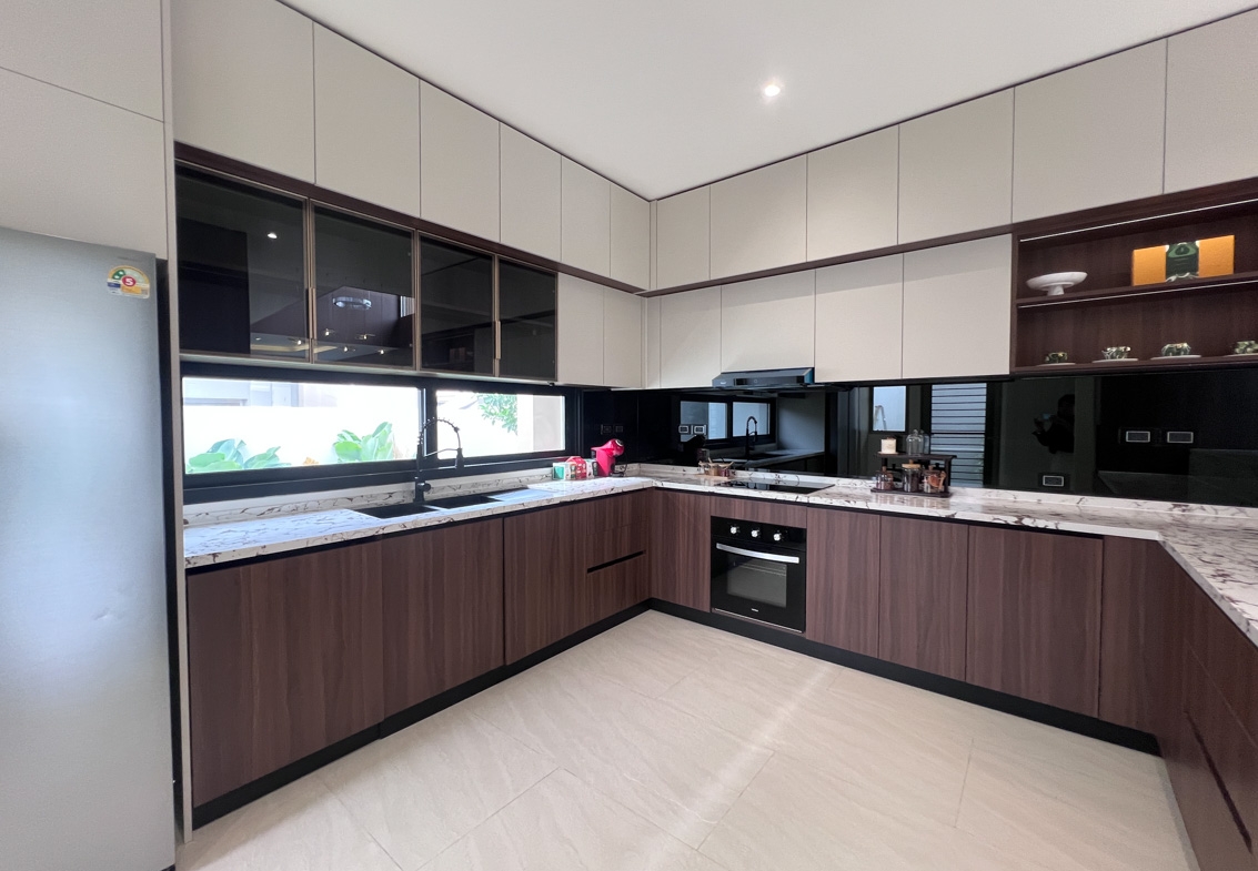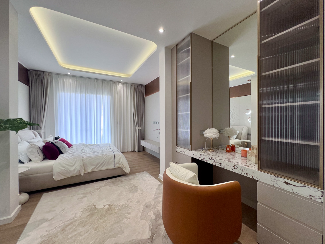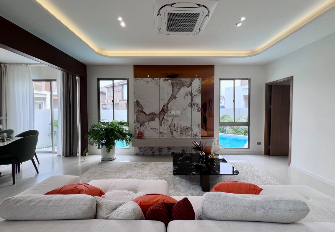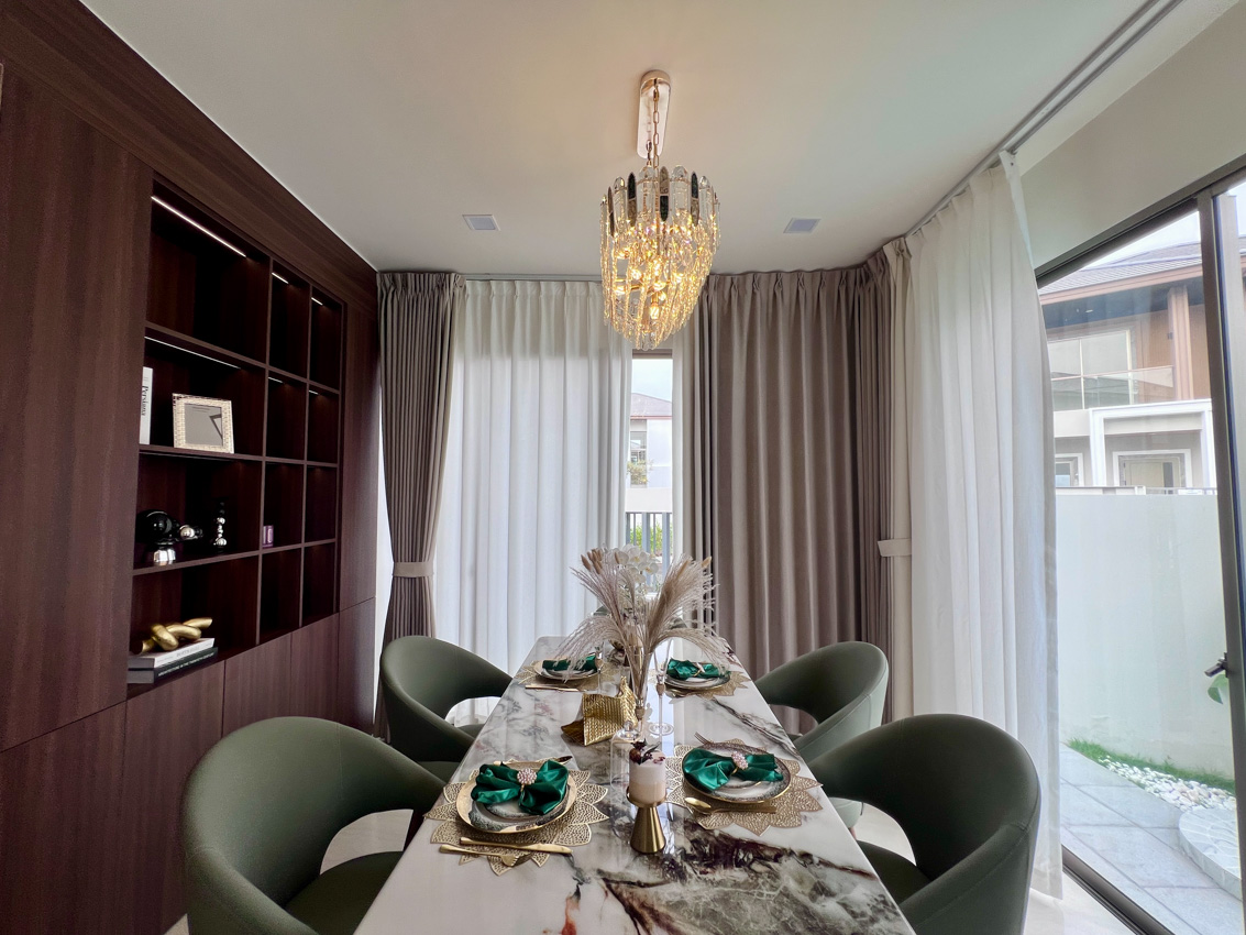 The most spacious house, uniquely designed to serve every functional need of all generations in a double high-volume space with a high ceiling. Experience the freedom in living space with your private bathrooms in all four bedrooms, one with a walk-in closet, an additional storage room, two parking spaces, a multi-purpose pavilion, and an option of a spacious swimming pool to elevate comfort for all family members.