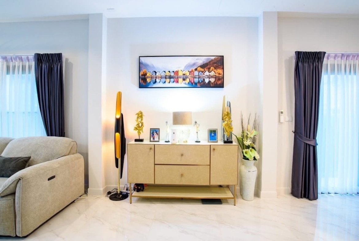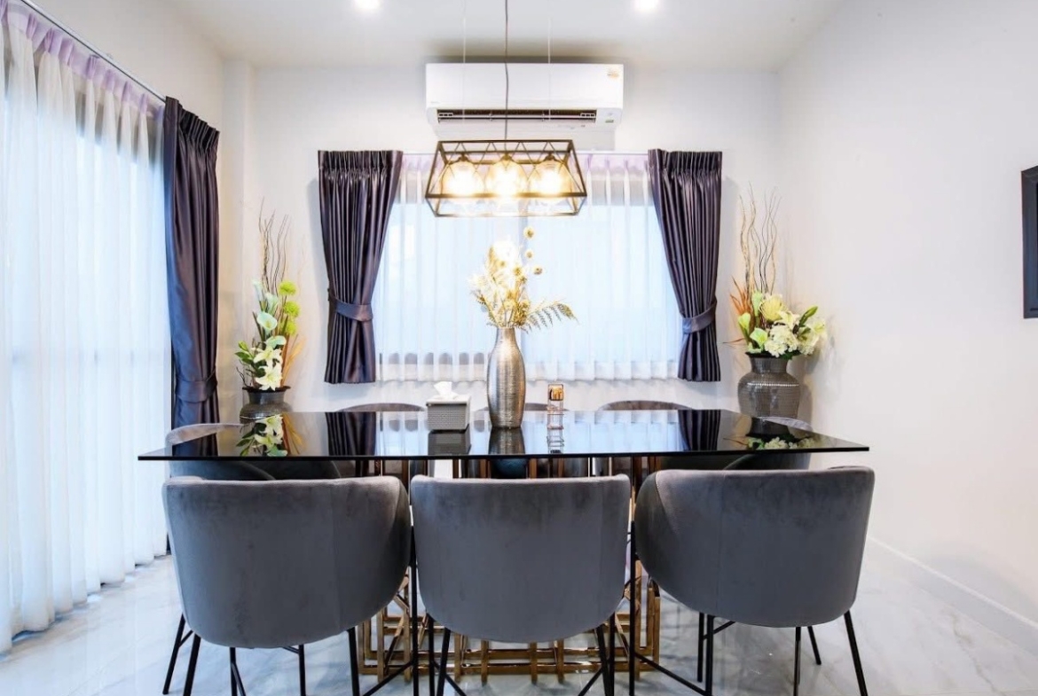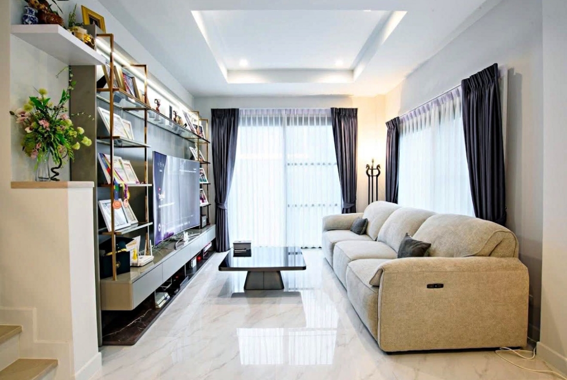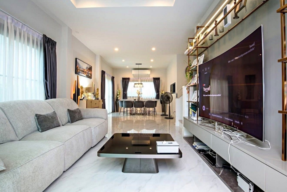 This house has 4 bedrroms 4 bathrooms, 206 of living space sitting on a plot of land 59.8 sq.wha with a carpark. It comes fully furnished modern kitchen, dining area, living area. This house for sale in Thai name.