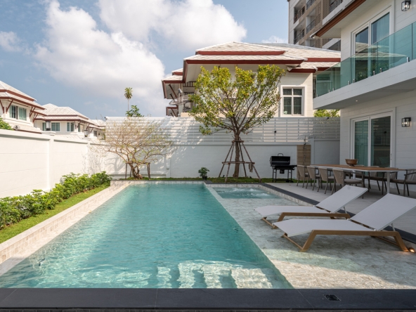 This house has 3 bedrooms and 4 bathrooms, each with an en-suite bathroom. It is situated on the land size of 272 sqm and offers 250 sqm of living space. There is a spacious living room and pool table area for relaxation. The surroundings of the house provide a warm feeling for the residents, fully furnished European kitchen and dining area. This house is for rent.